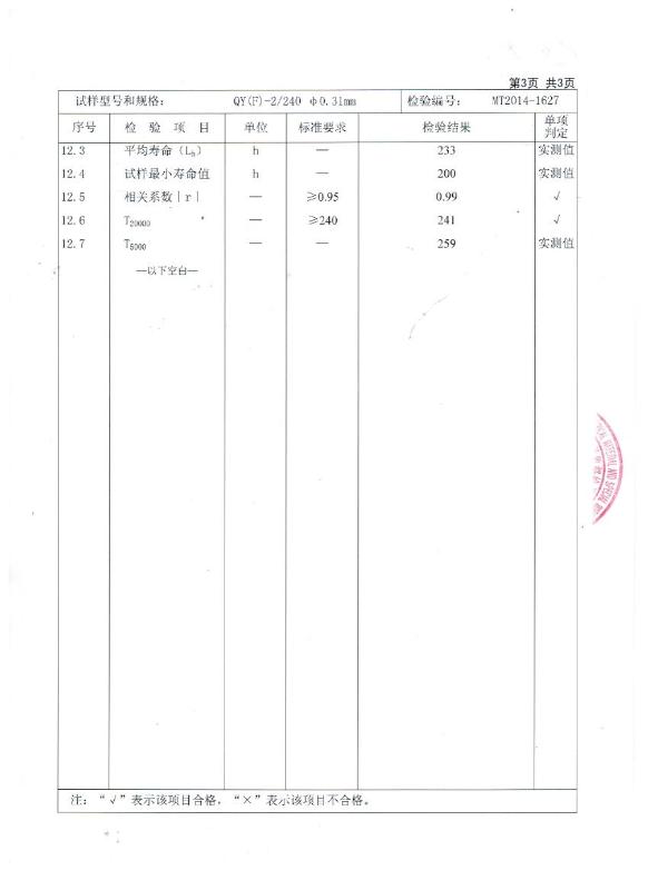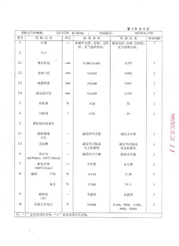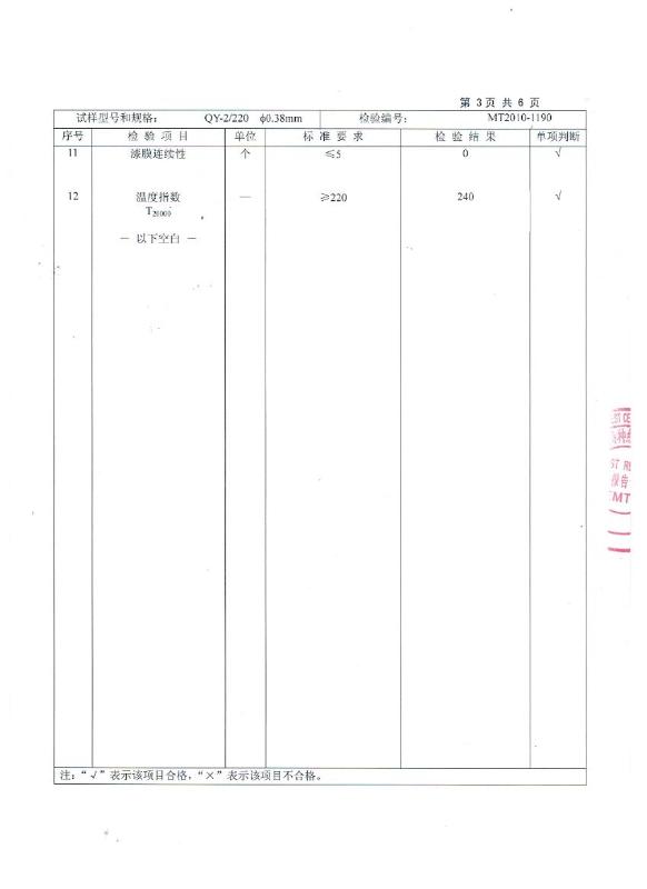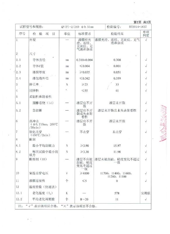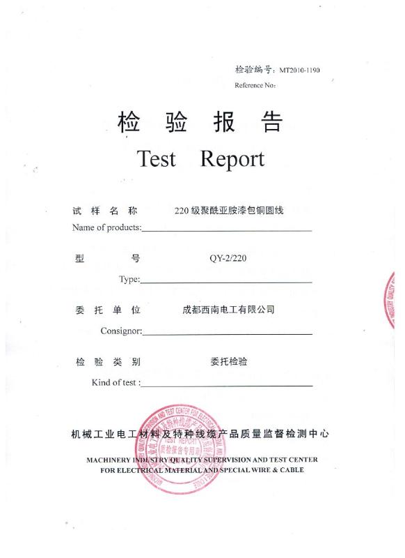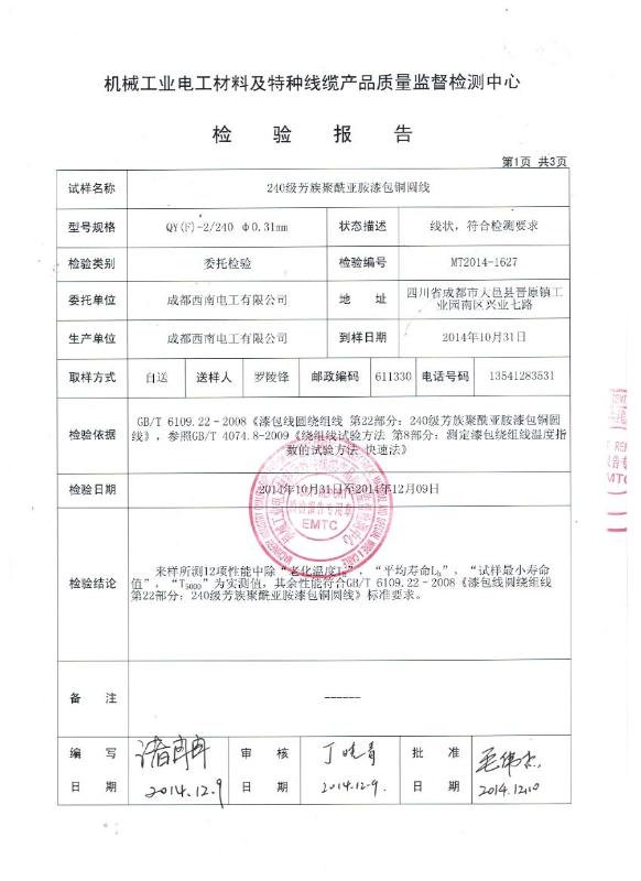 我公司220级聚酰亚胺、240级芳族聚酰亚胺漆包铜圆线于2014年12月通过上缆所型式试验,这代表着西南电工在聚酰亚胺漆包线领域取得了长足的进步。220级聚酰亚胺、240级芳族聚酰亚胺漆包线的产品特性为耐超高温、超低温、抗辐射、超负荷能力强,绝缘性能优异,使用领域将全面覆盖航空航天、国防军工、核能等多种特殊领域。
