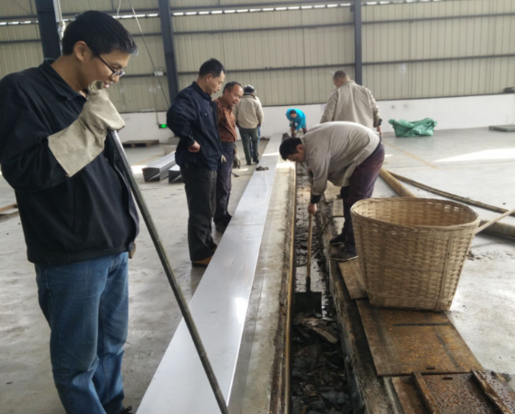 12月26日,拉丝车间改造润滑液循环渠,因之前的循环渠是砖砌结构,时间久了润滑液可能会浸出,污染环境,造成浪费,公司领导经研究决定将循环渠改造成不锈钢结构的,从源头上杜绝污染,杜绝浪费。整个循环渠全长78米,需要将原有的循环渠顶部全部揭开,然后将内部平整,再将订做好的不锈钢槽放置到渠里面,最后再用水泥砂石将空隙处填平,盖上盖板。整个工程工序较多,比较繁琐,公司各部门,从公司领导,到管理人员,再到每个员工,大家在完成本职工作之余都纷纷加入到这项改造工程中。各部门员工,特别是设备组员工和拉丝车间员工,互相配合,团结协作,耗时五天,在没有影响任何生产任务情况下,完成了这项改造工程。