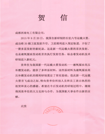 贵单位为我国新一代运载火箭发动机——液氧煤油高压补燃发动机,提供了多种原材料,这些原材料为液氧煤油高压补燃发动机的顺利研制奠定了坚定基础。值此新一代运载火箭首飞成功之际,特向贵单位科技人员和员工表示热烈的祝贺和衷心的感谢。希望在今后发动机的研制过程中,继续得到贵单位的大力支持与合作,为我国航天事业作出新的贡献。