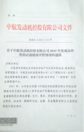2015年,中航发动机控股有限公司依据《供应商绩效评价手册》,组织15家军品批产所属单位位533家供应商在质量、交付、服务、价格等方面进行评价,并分附件、成品件、锻铸件毛坯、金属、非金属原材料五大类供应商进行综合排名。
