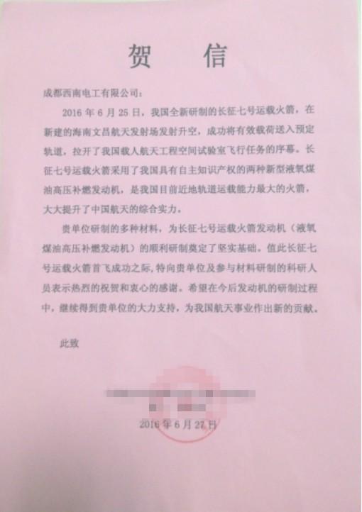 我公司供应的漆包铜圆线为长征七号运载火箭发动机(液氧煤油高压补燃发动机)的顺利研制奠定了坚实基础。值此长号运载火箭首飞成功之际,该研究所给我公司发来贺信,对我公司表示热烈的祝贺和衷心的感谢。希望在今后发动机的研制过程中,继续得到我公司的支持,为我国航天事业作出新的贡献.